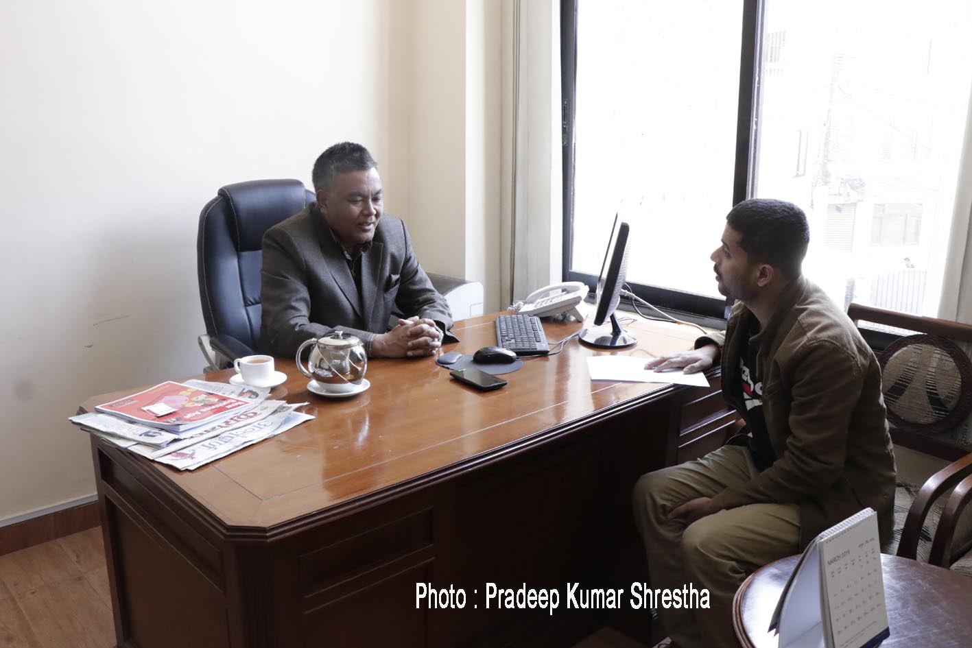 विनायक शाह / Binayak Shaha : विनायक शाह यो फोटा अध्यक्ष हुनु भन्दा अगाडि खिचेको फोटो हो । अन्तर्बाता गर्ने पत्रकार तमिज गिरी हुनु हुन्छ । अन्तर्वार्ता उहाँकै होटल एयरपोर्टमा लिएको हो ।