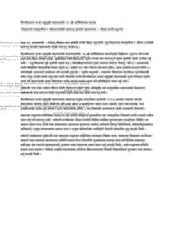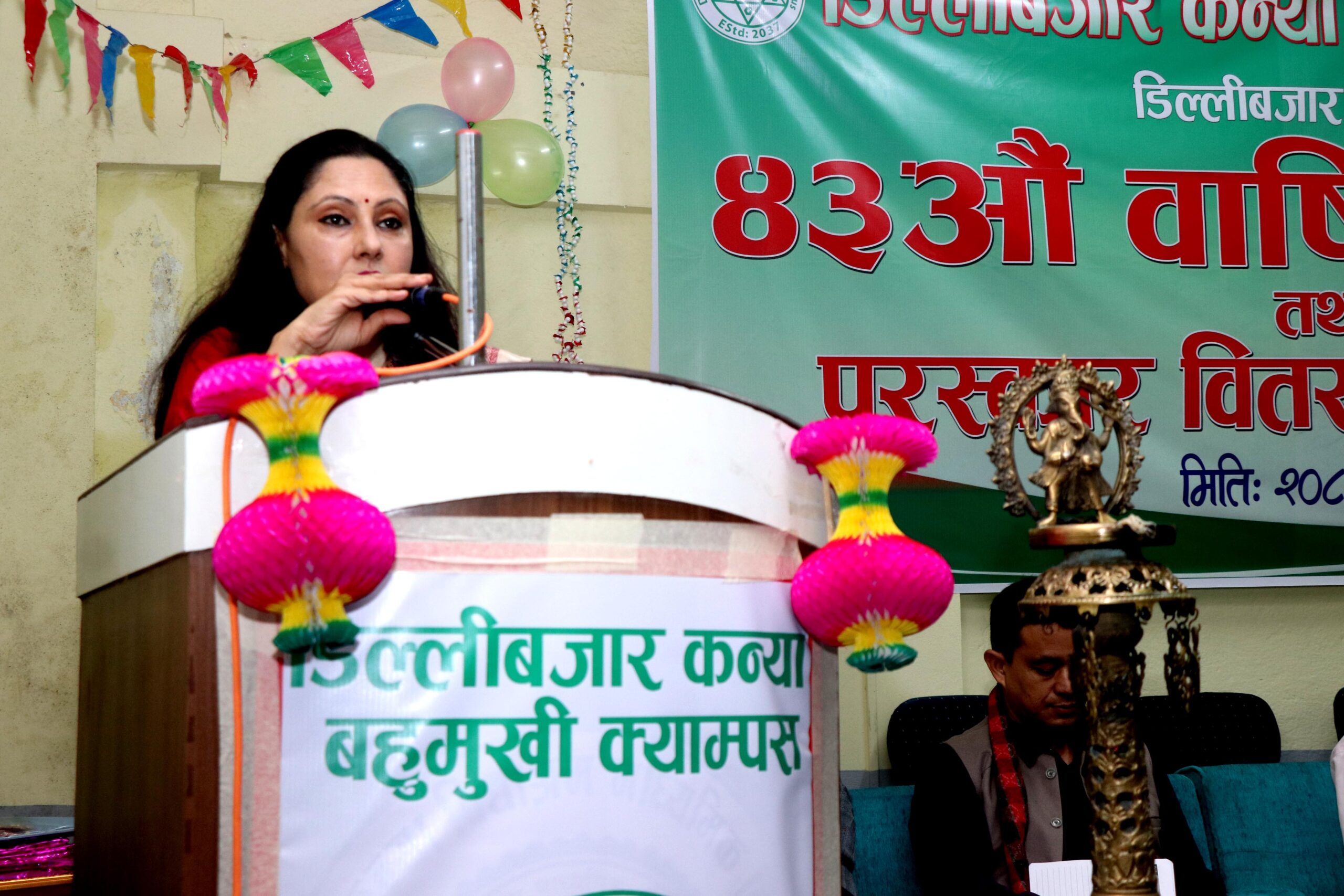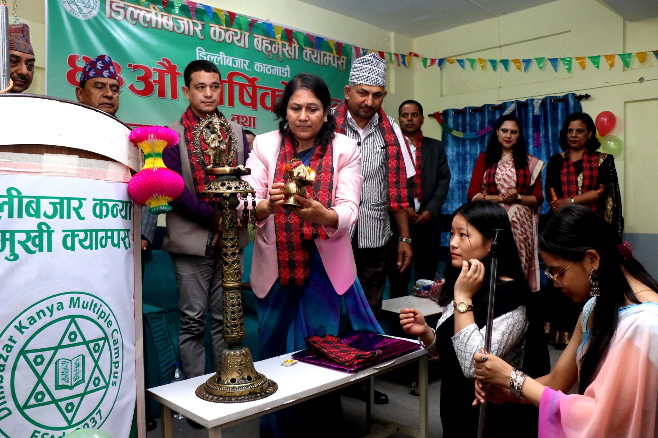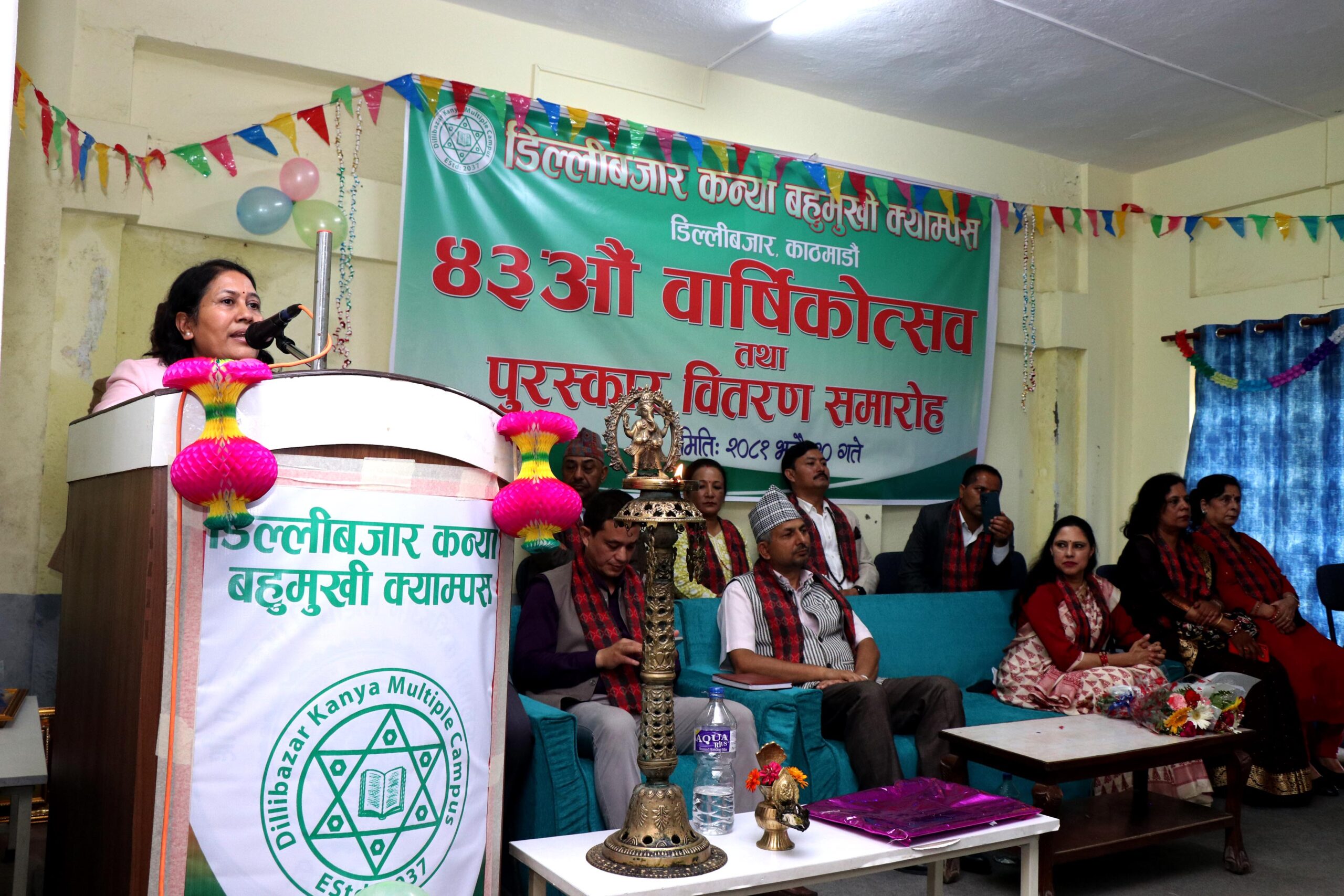 डिल्लीबजार कन्या बहुमुखी क्याम्पसको काठमाण्डौको ४३ औं वार्षिकोत्सव समारोहको बिहीबार उद्घाटन गर्दै मन्त्री भट्टराईले शिक्षा क्षेत्रमा रहेका चुनौतीहरु चिर्दै शिक्षालाई आशा लाग्दो क्षेत्र बनाउनु नै मुख्य चुनौती रहेको उल्लेख गर्नु भयो । “उच्च शिक्षामा थुप्रै चुनौती रहेका छन् । विश्वविद्यालयलाई पूणर् स्वायत्त बनाएर लैजानु पर्ने छ । अध्ययनको लागि विदेशिने विद्यार्थीको संख्या बढ्दो छ । बाहिर गए भनेर चिन्ता गरेरमात्र हँदैन् । आज हामीले बनाउने नीति १० वर्षपछिको पुस्तालाई सम्बोधन गर्ने खालको हुनुपर्छ ।” उहाँले भन्नुभयो । पद्यकन्या विद्याश्रम मा।वि।का पूर्व विद्यार्थी समेत रहनु भएकी मन्त्री भट्टराईले नारी शिक्षाको लागि डिल्लीबजार कन्या बहुमुखी क्याम्पसको ठूलो योगदान रहको चर्चा गर्दै क्याम्पसको समग्र विकासका लागि आफुले सक्दो प्रयास गर्ने प्रतिविद्धता व्यक्त गर्नु भयो ।