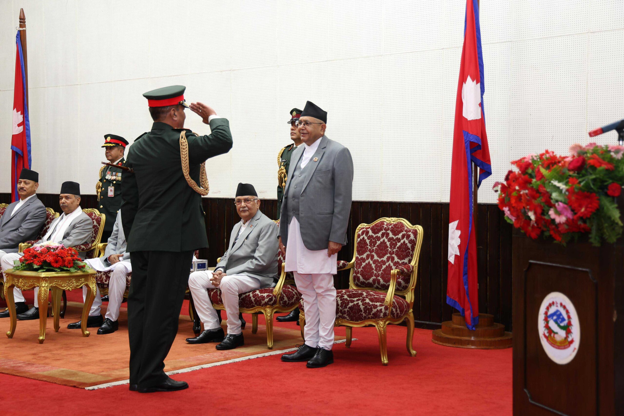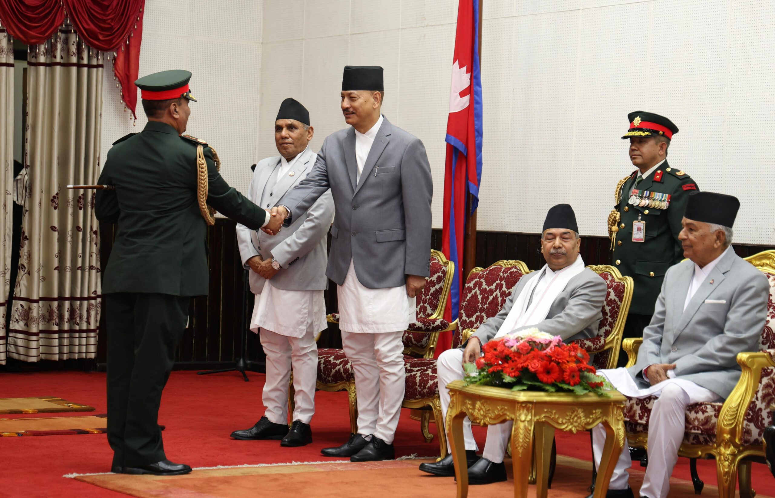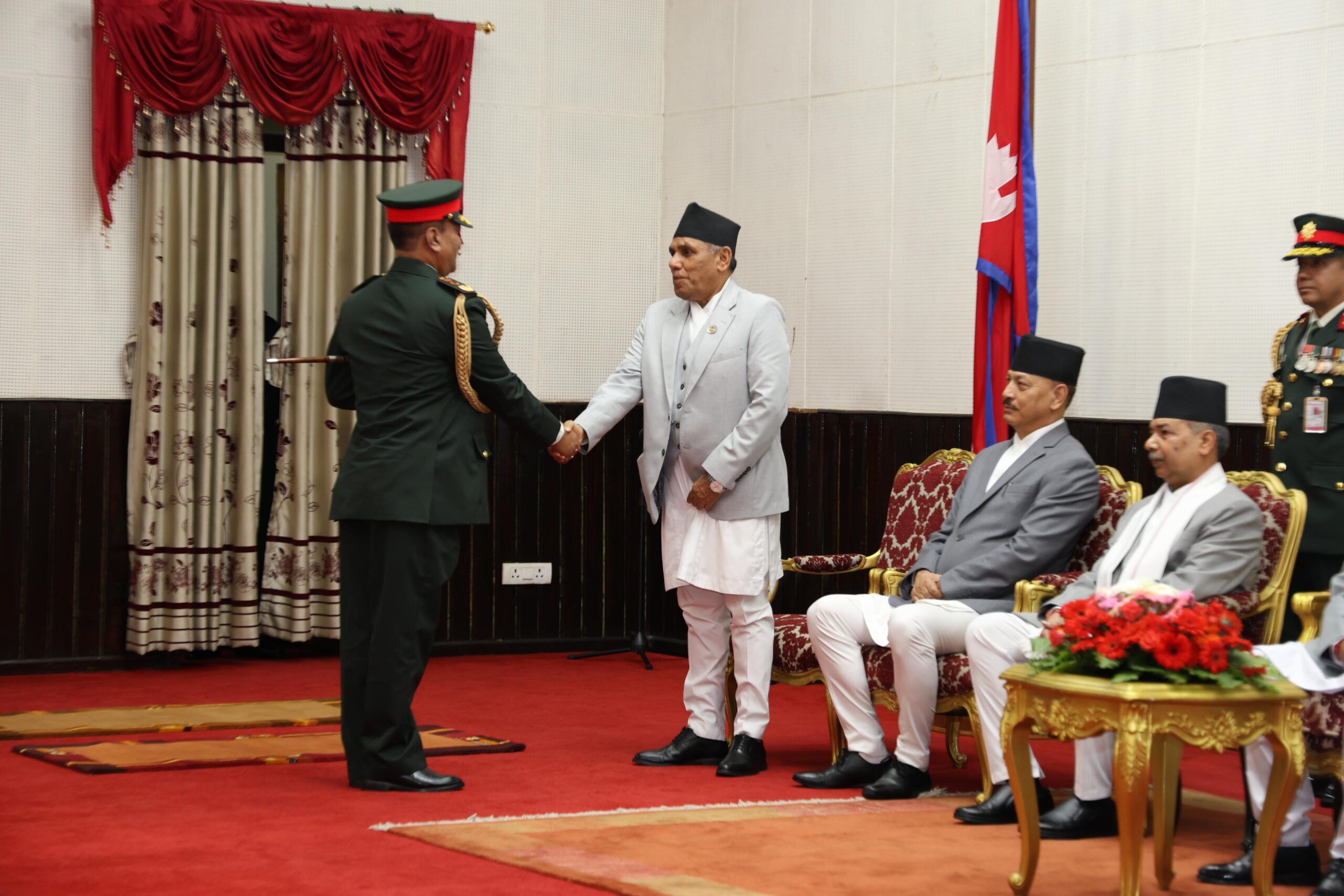 भदौ २४ काठमाडौं नेपाली सेनाका नवनियुक्त प्रधान सेनापति अशोकराज सिग्देललाई शपथ गराउनुहुँदै राष्ट्रपति रामचन्द्र पौडेल । । तस्बिर : प्रदीपराज वन्त, रासस