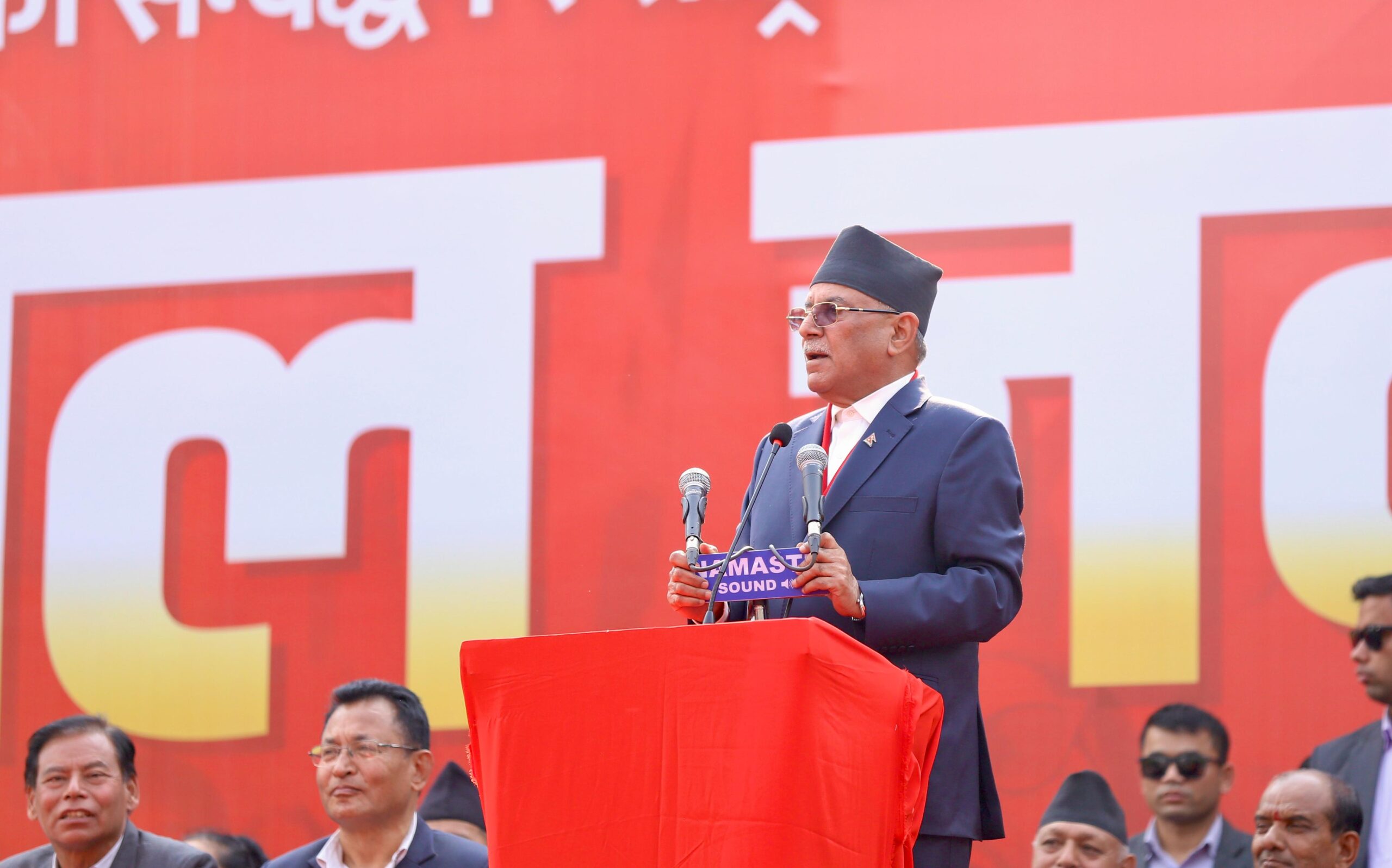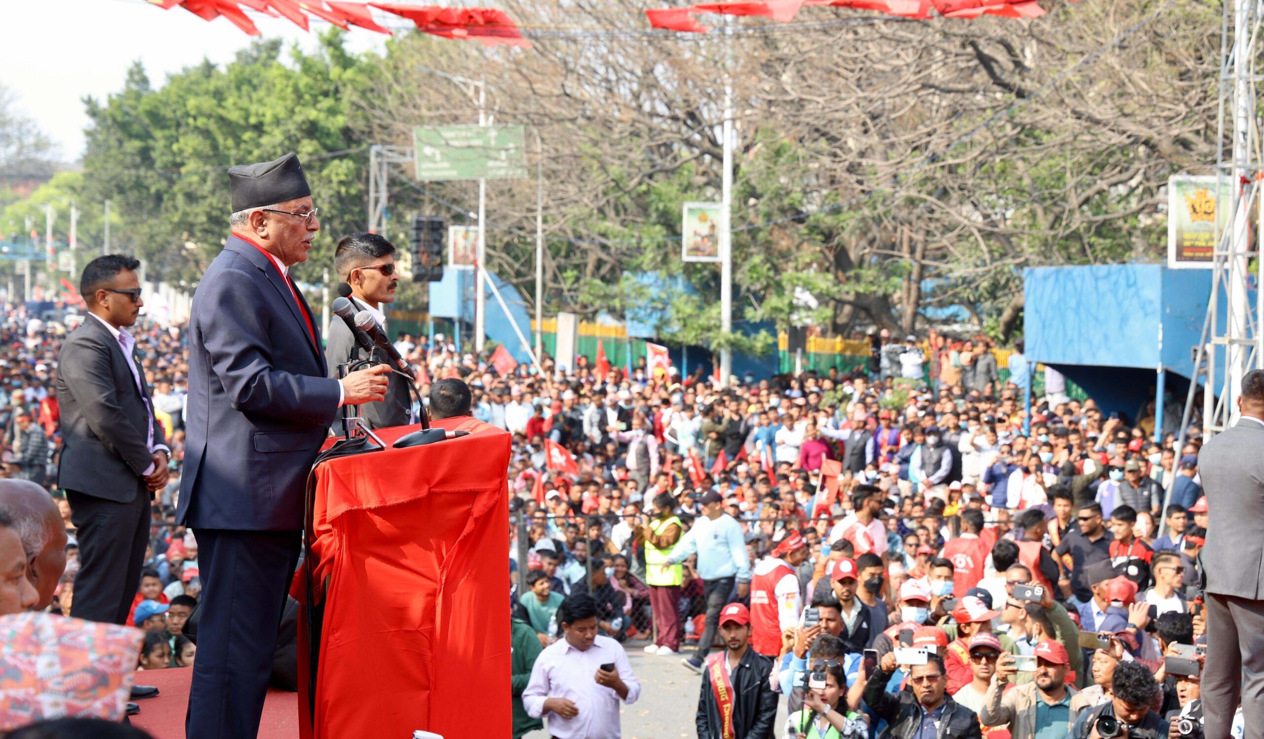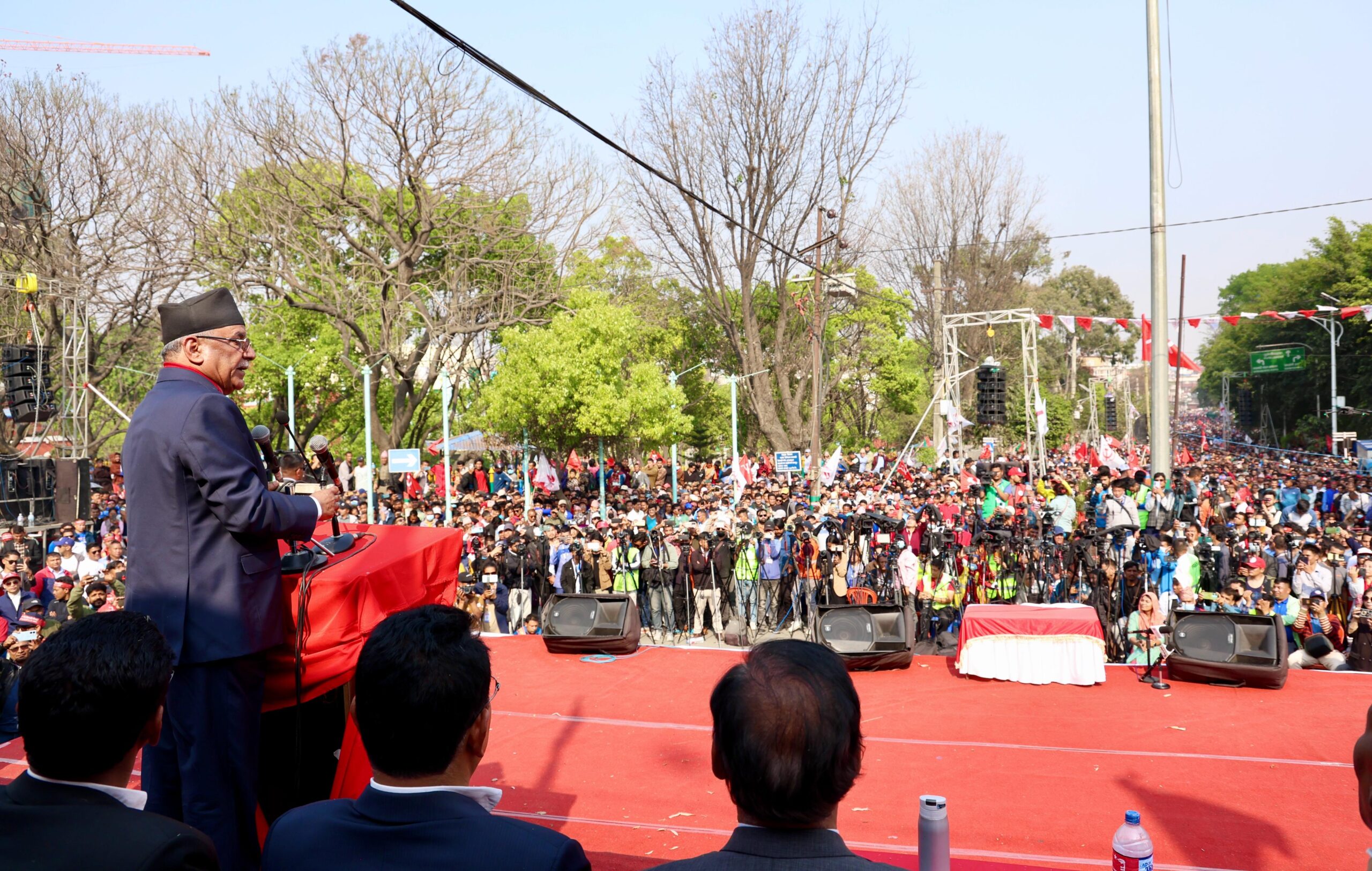 चैत १५ काठमाडौ समाजवादी मोर्चाको विशाल आमसभालाई सम्बोधन गर्दै पूर्व प्रधानमन्त्री तथा नेकपा माओवादी केन्द्रका अध्यक्ष पुष्पकमल दाहाल प्रचण्ड ।
