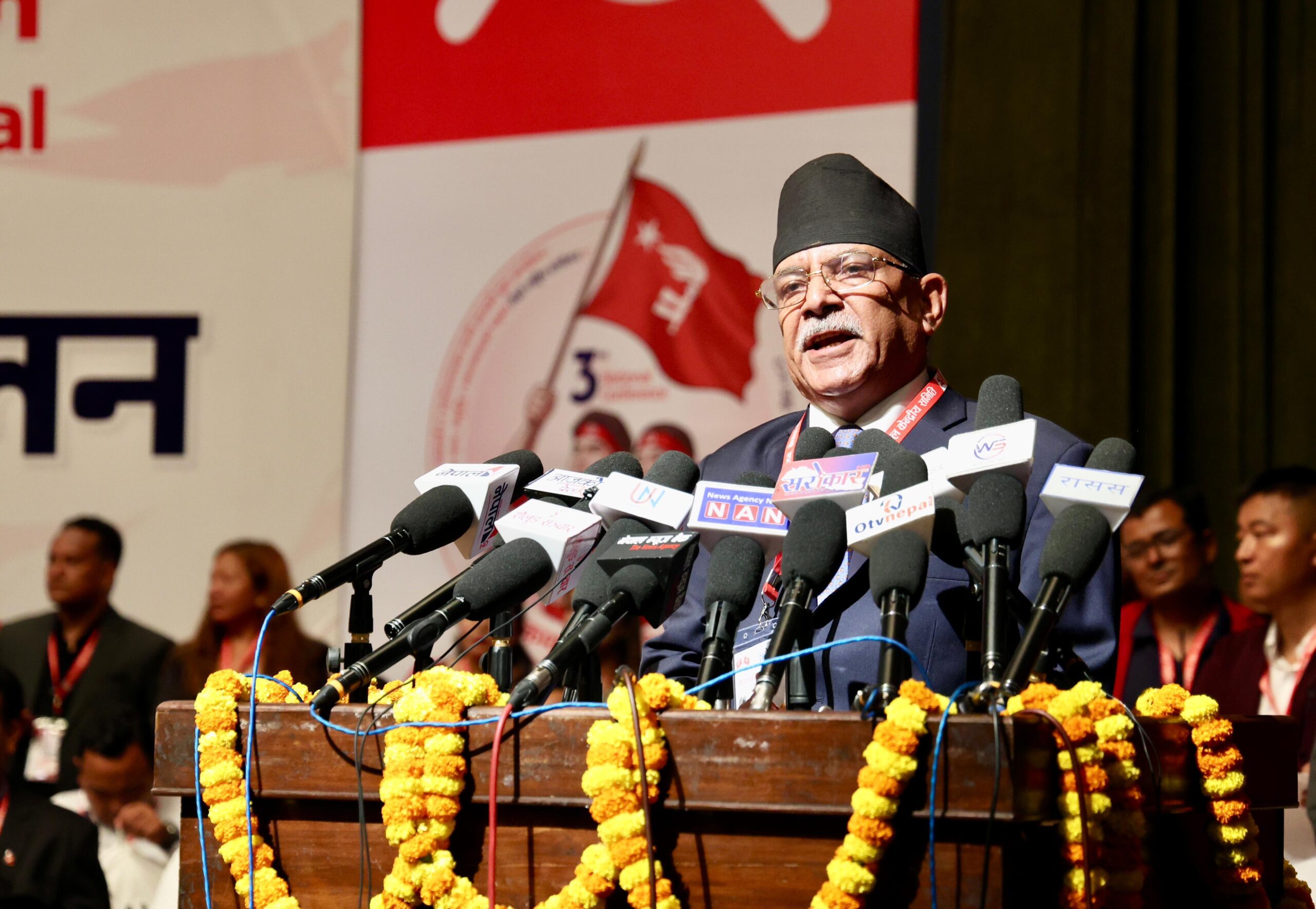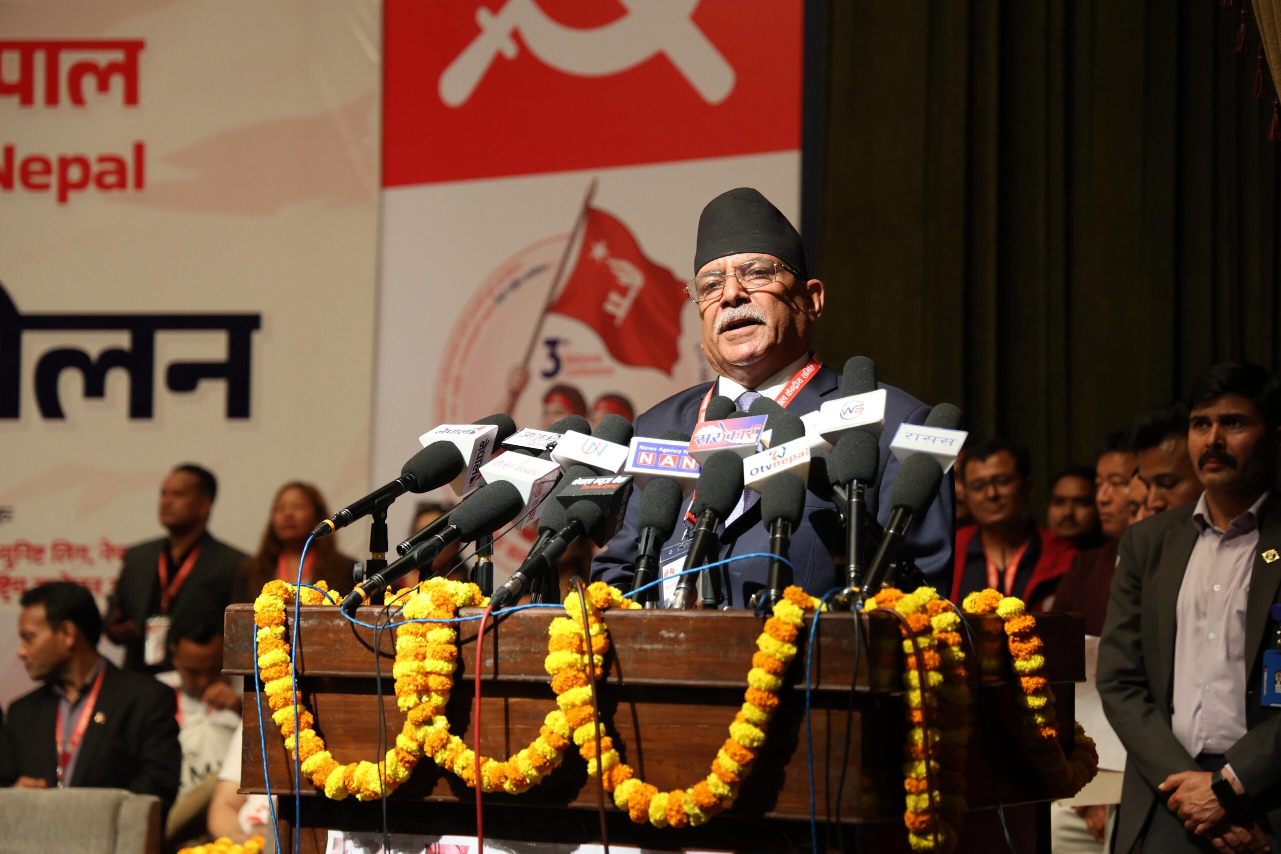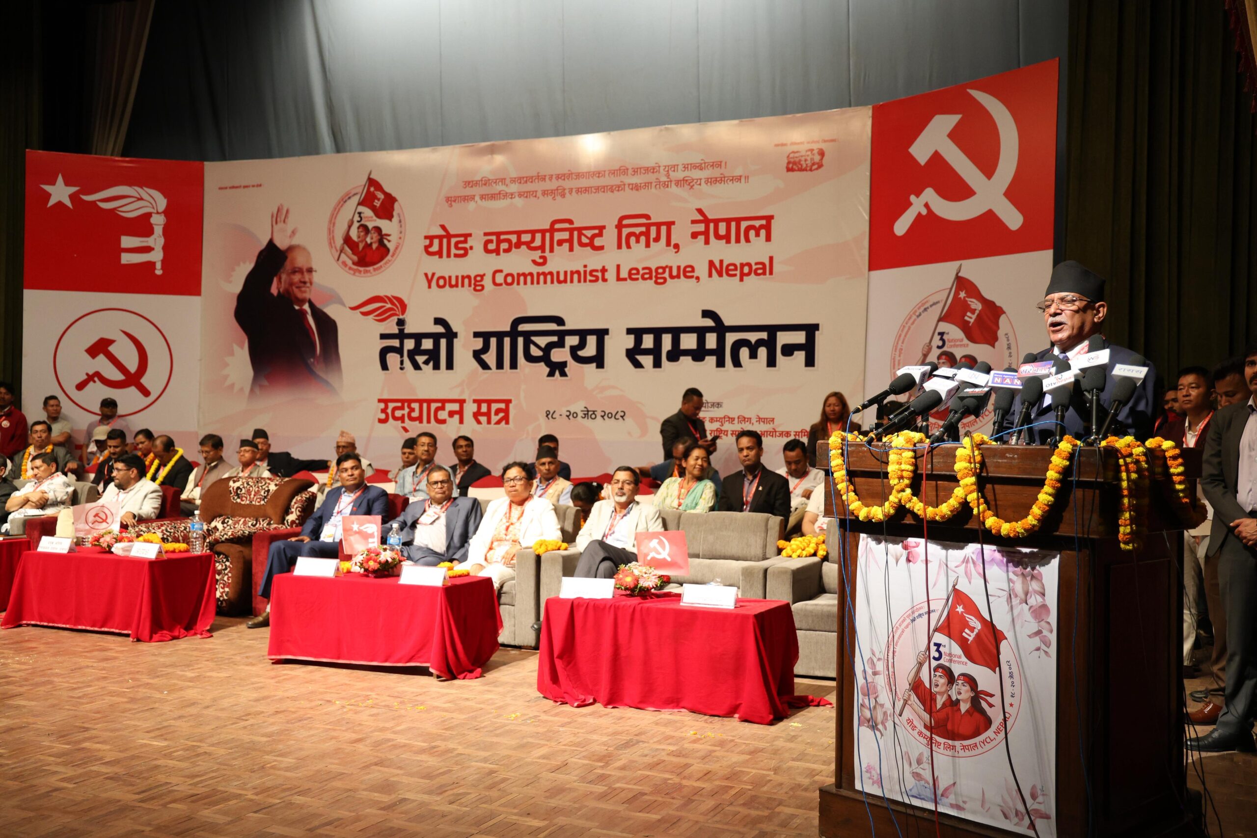 २०८२ जेठ १८ गते योङ कम्युनिष्ट लिग नेपालको तेस्रो राष्ट्रिय सम्मेलनको समुद्घान कार्यक्रमलाई सम्बोधन गर्नु हुँदै नेपाल कम्युनिस्ट पार्टी (माओवादी केन्द्र) का अध्यक्ष पूर्व प्रधानमन्त्री पुष्पकमल दाहाल ‘प्रचण्ड’ ।